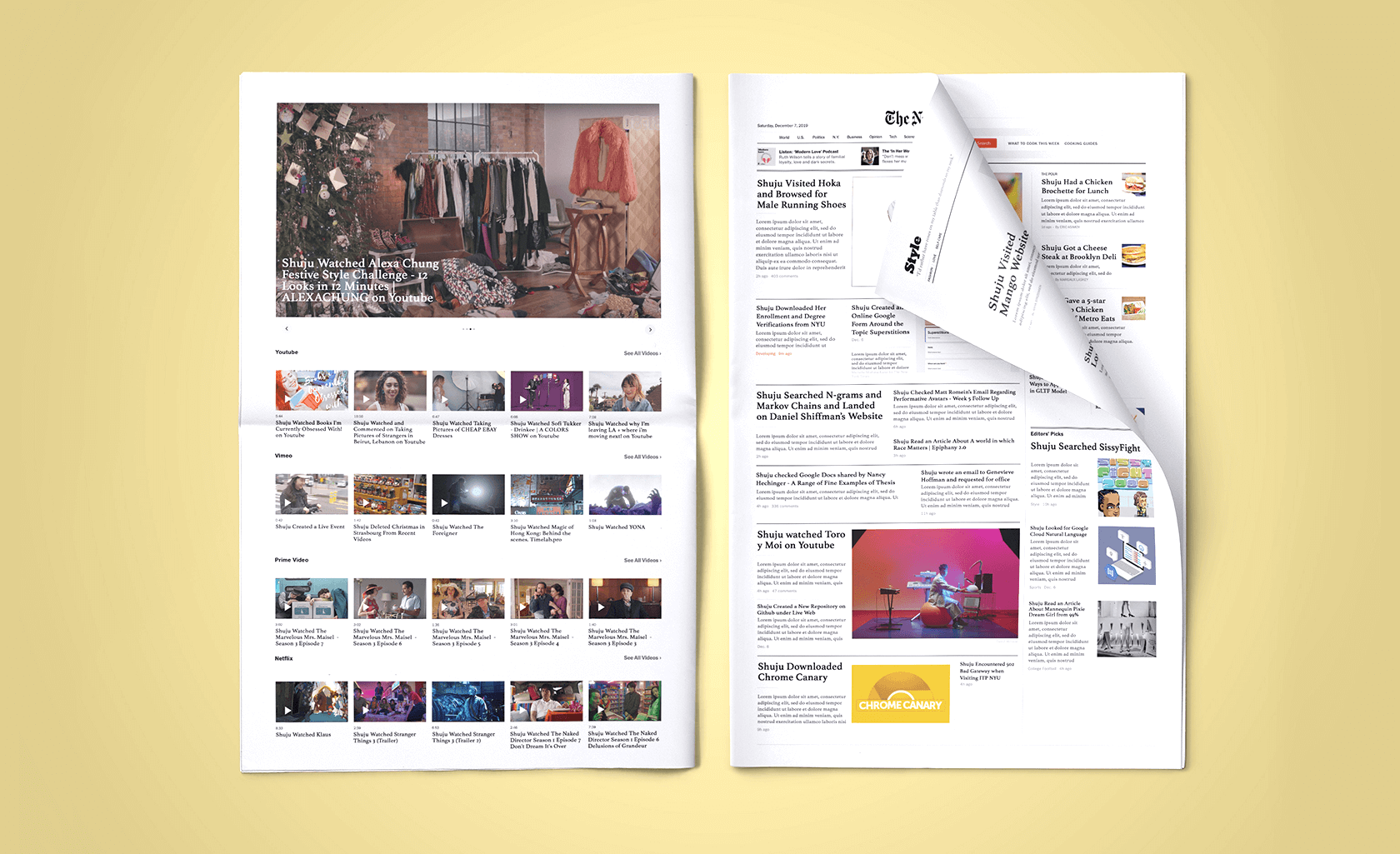A project investigating data collection and privacy on web through an online and offline experiment. The online form takes user's browsing history and turn them into New York Times' headline and stories every time they visits the page. The offline form takes the situation further by reproducing them into a hard copy.