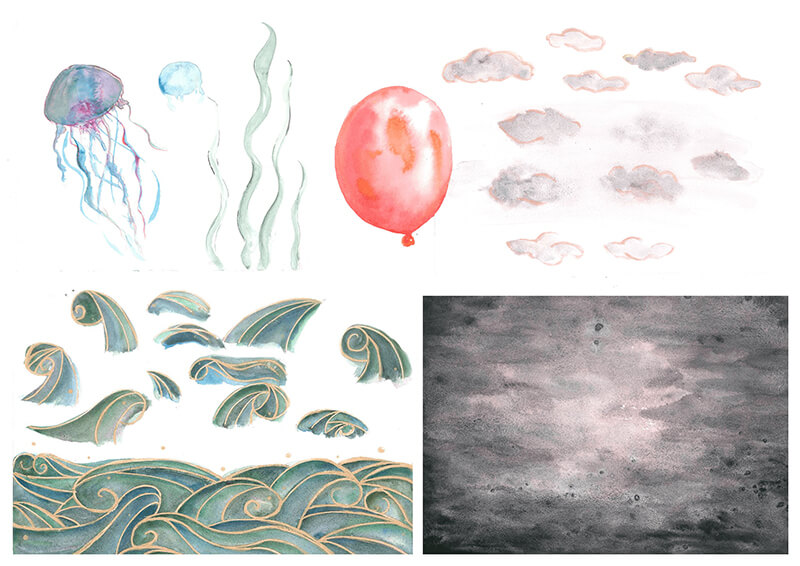 The story walks us through the transformation with abstract forms. The two opposing visual styles, vector and watercolor, portrays the difference between our outer and inner world.