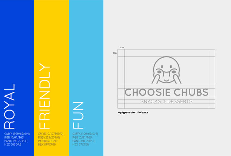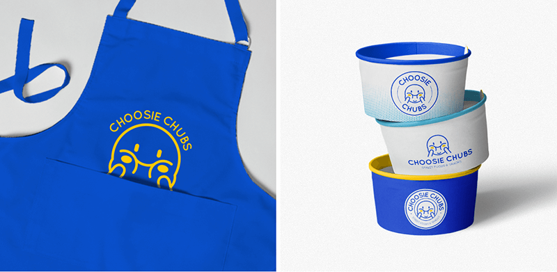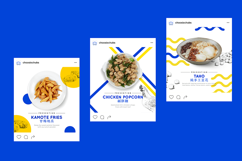 A branding project for the food stall Choosie Chubs. It serve some of the popular street food from Taiwan. While the name might suggest, street food is known for its affordability, this lead to a rather broad target market. Building on top of this insight, the vibe of the brand was set to be light-hearted and approachable. The color palette is a dominant royal blue with a supplementary shade of yellow. The chosen logotype was inspired by the impression of children staring at delightful pastries in a bakery storefront.