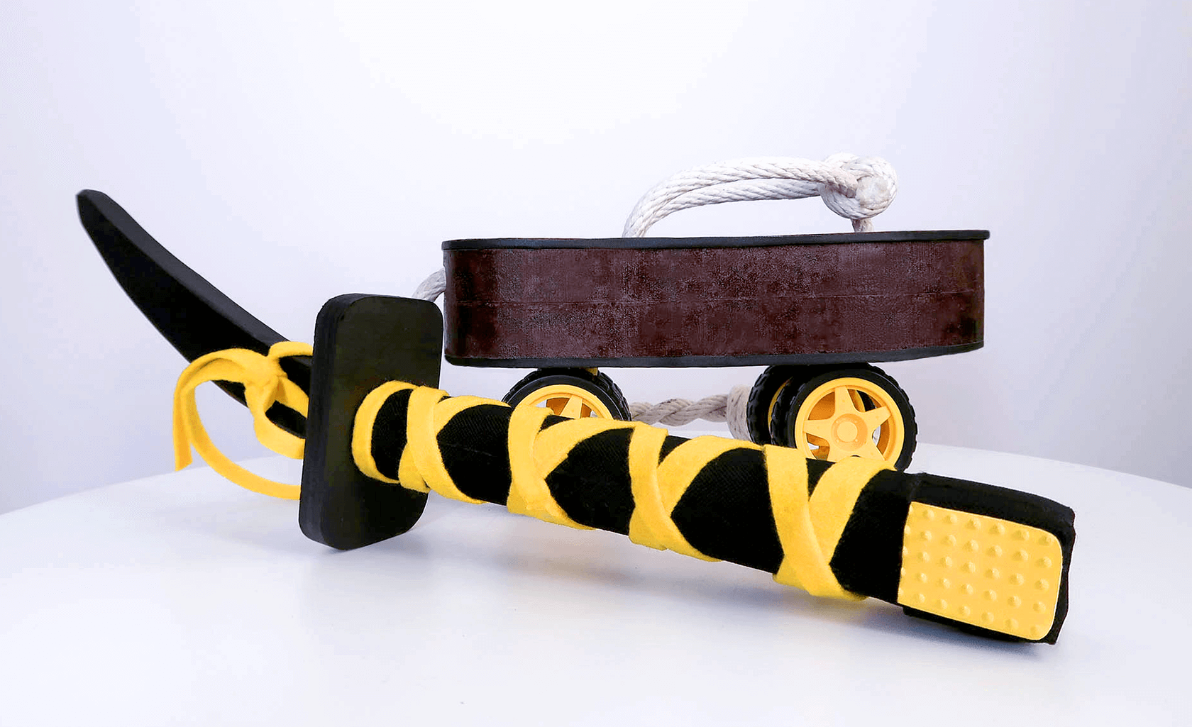 The overall aesthetic of the device was inspired by the Japanese samurai sandals. It is accounted to be mobile, durable, and easy-carry. The dagger's handle contains remote control to trigger the footwear forward when pressed. The leash attached at the end leave spaces as it pass through the door.