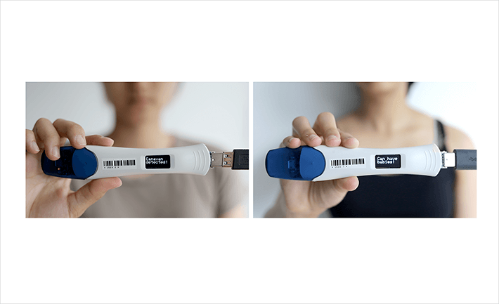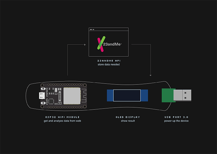 We built an USB flash drive on top of a traditional, pre-existing pregnancy device to imply how accessible our bio-data is in present technology. Inside the object is a micro-controller with WiFi module and OLED display; that when plugged, acquires data from 23andMe, analyzes and sends it back to the device. User with mutant in their gene were advised not to have offspring and vice-versa.