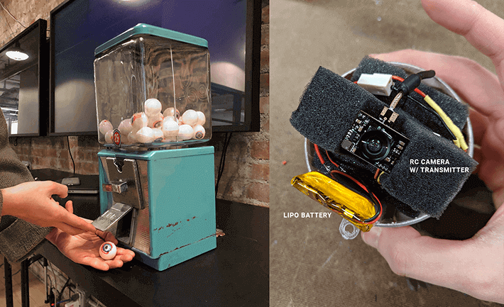 IBall is a critical object around mass surveillance topic. The form of a candy machine suggests how easy and available it is to surveil your surroundings. The mood we want to deliver was playful, absurd, and shame. By humanizing the object, we want to make people aware that they are being looked backed while they looked onto others.