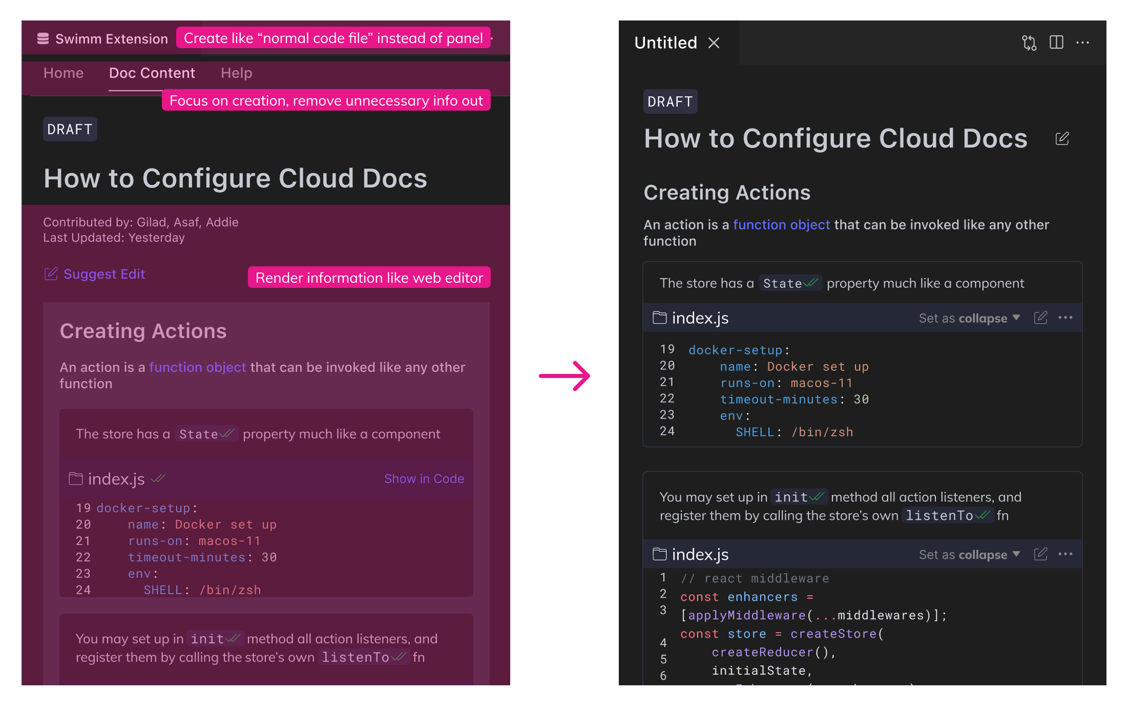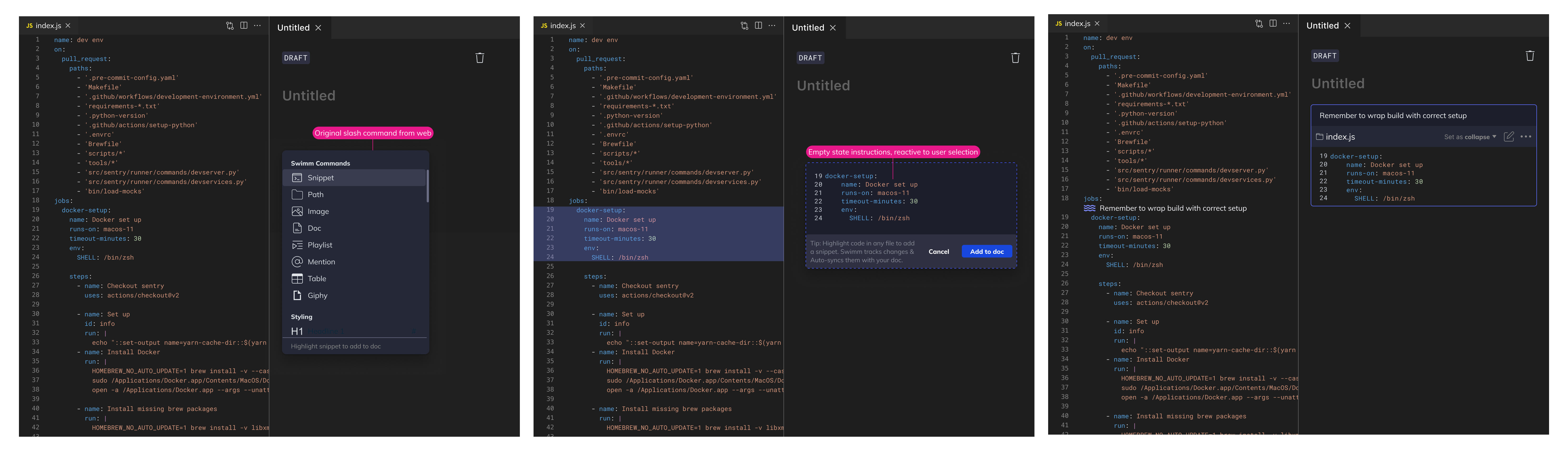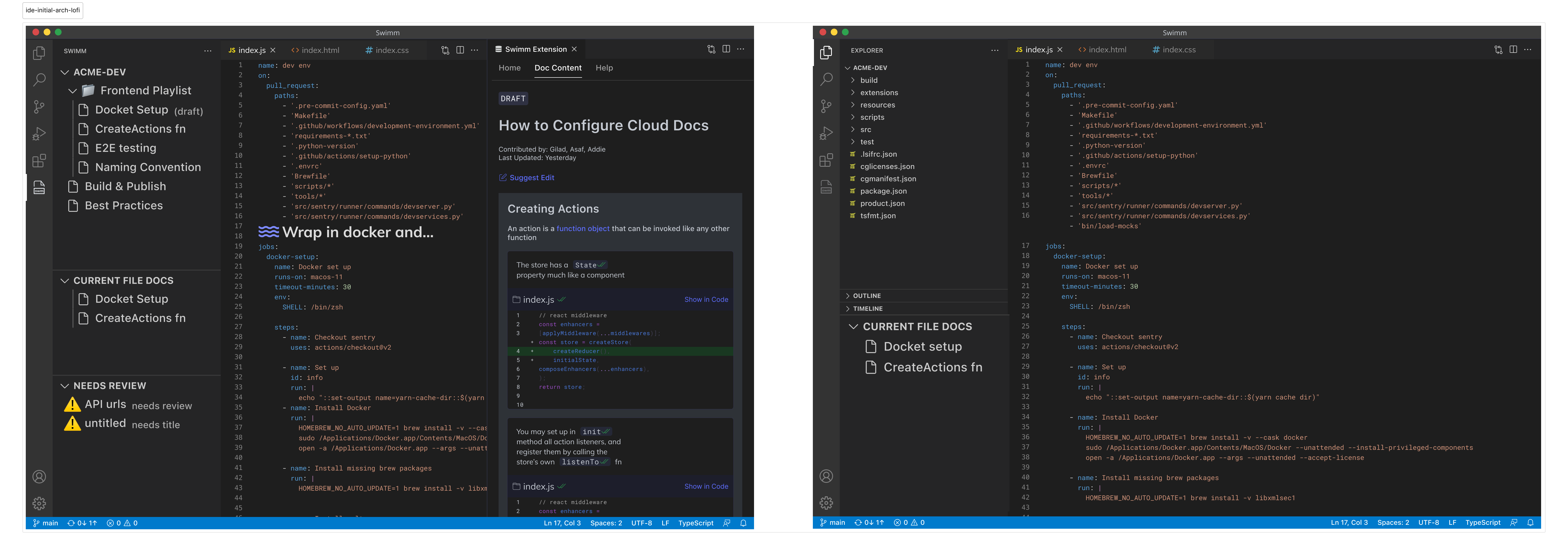 Swimm aims to streamline knowledge sharing among dev teams by improving code documentation practice and workflow. To avoid context switch, we've shifted from a web application to an IDE extension, enabling developers to code and document seamlessly within their daily environment.