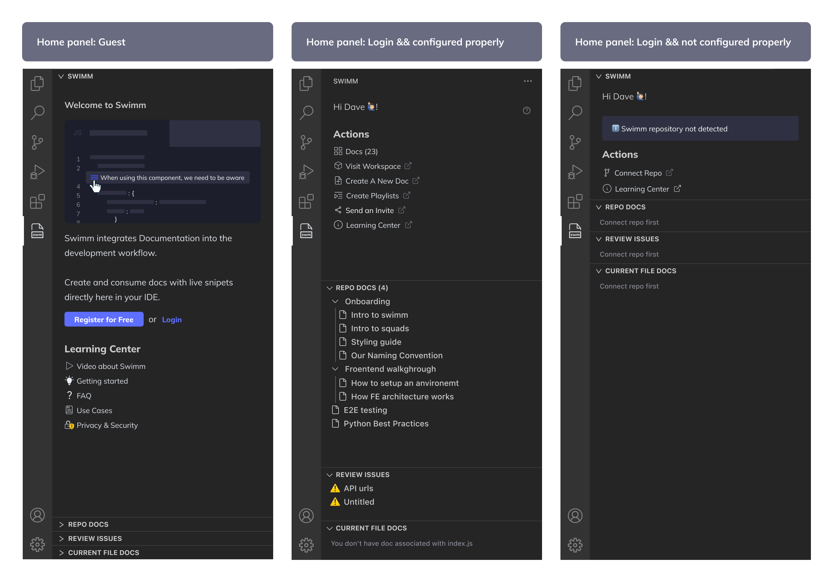 User's biggest expectation is to be able to use the core features — create, view, and maintain documents, without leaving their IDE. We are bringing our existing web features into a new environment. Some basic research are done both on the design and technical side:
