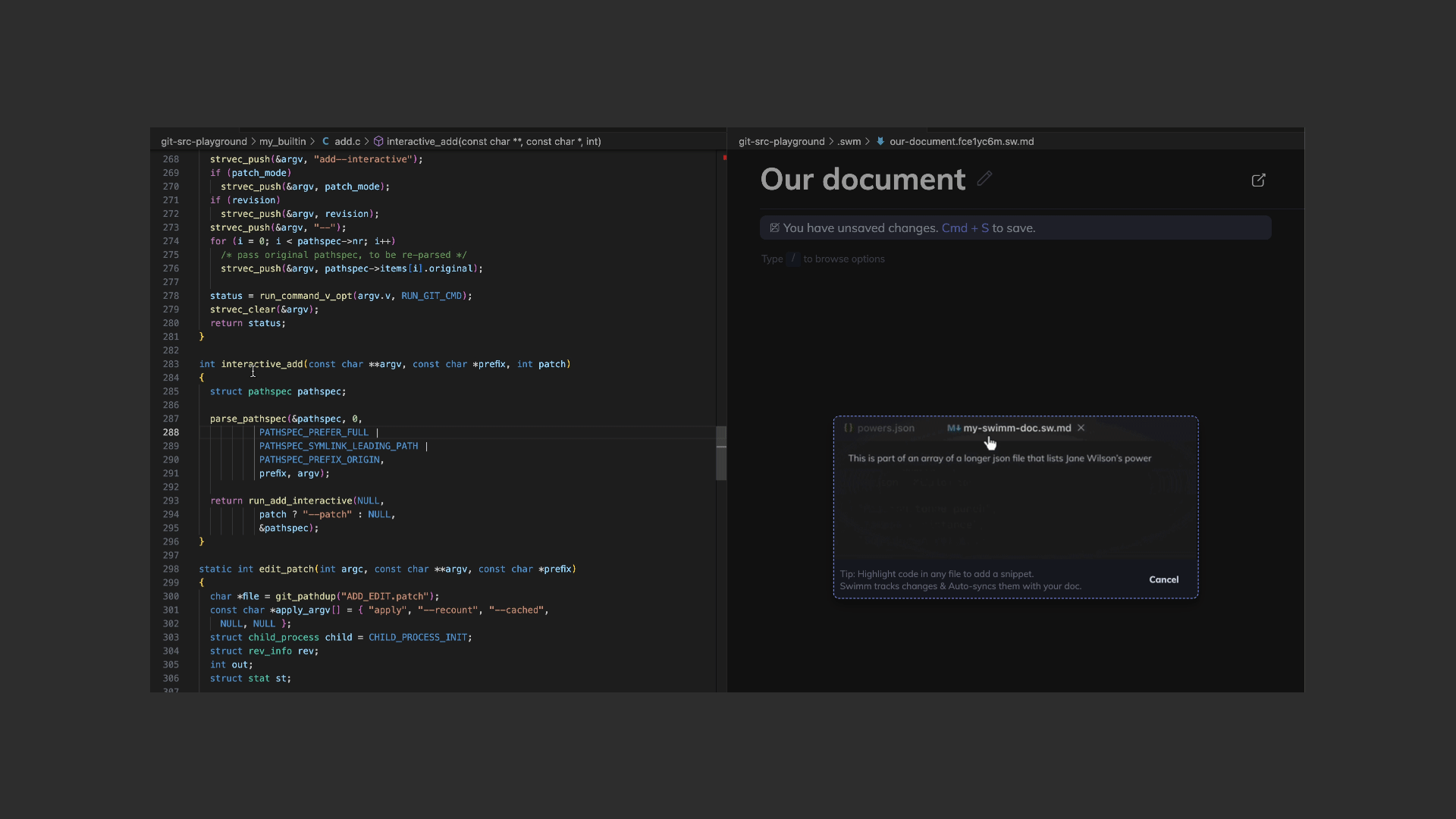 There is an opportunity to present a Swimm doc for a referenced code, which could be useful when coding.