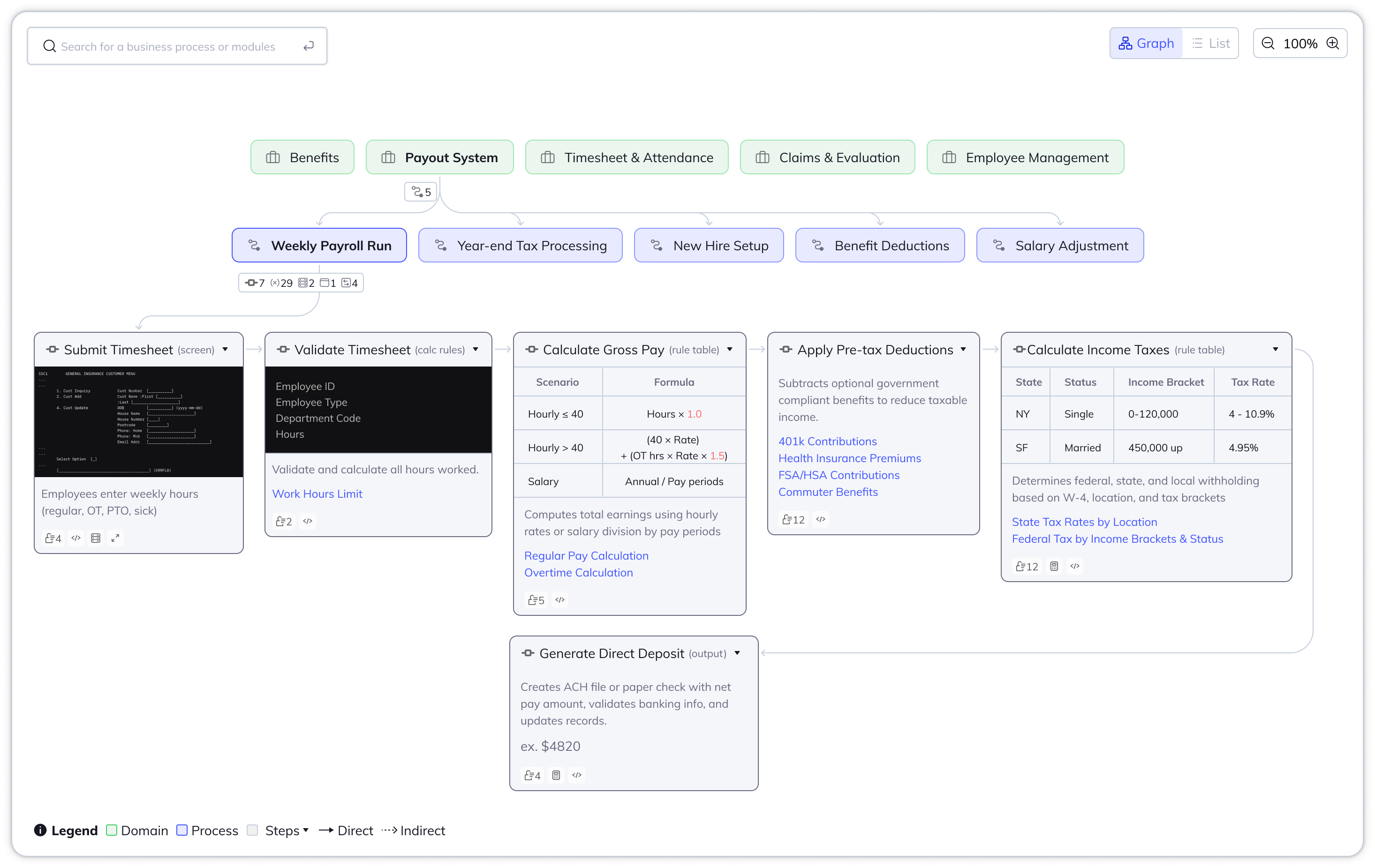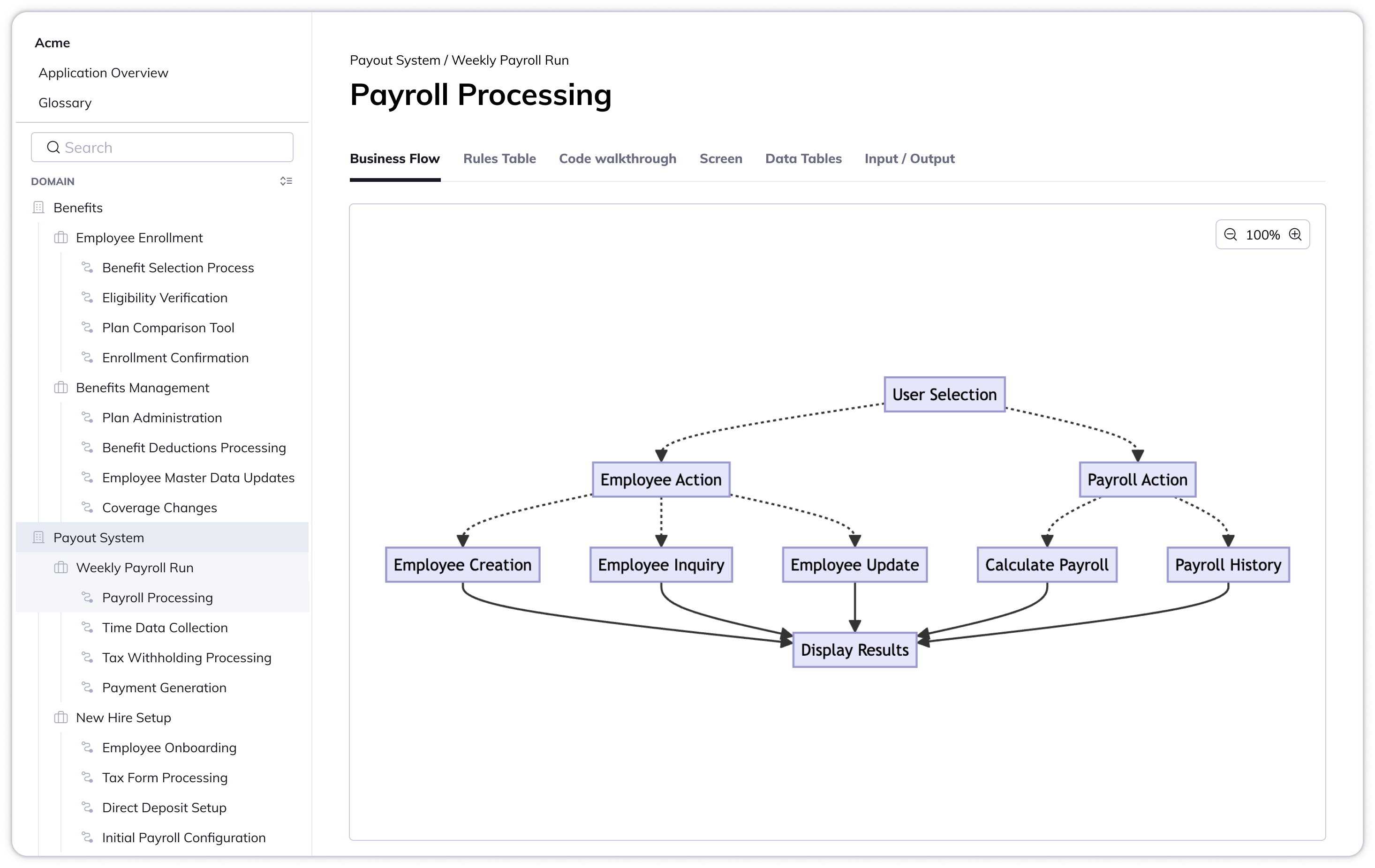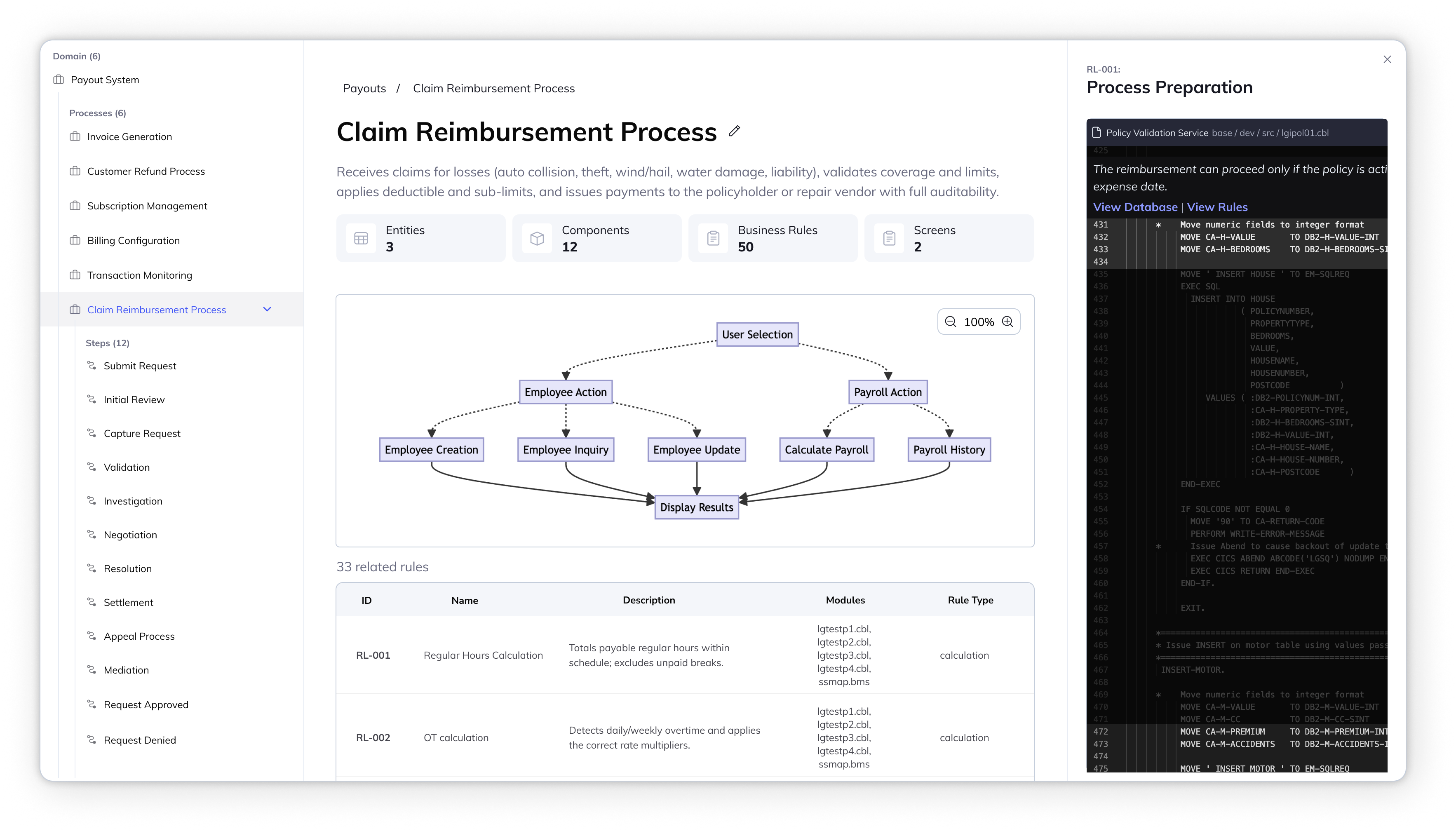 - Show process description: Related code artifacts should be clustered into business domain and process to ensure human-readability.
